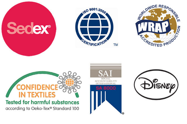 Many of our partner factories are certified by recognized organizations such as WRAP, Sedex, and Disney. As a company committed to Social Accountability and Ethical Sourcing, we also work with vendors who hold certifications like SA 8000.